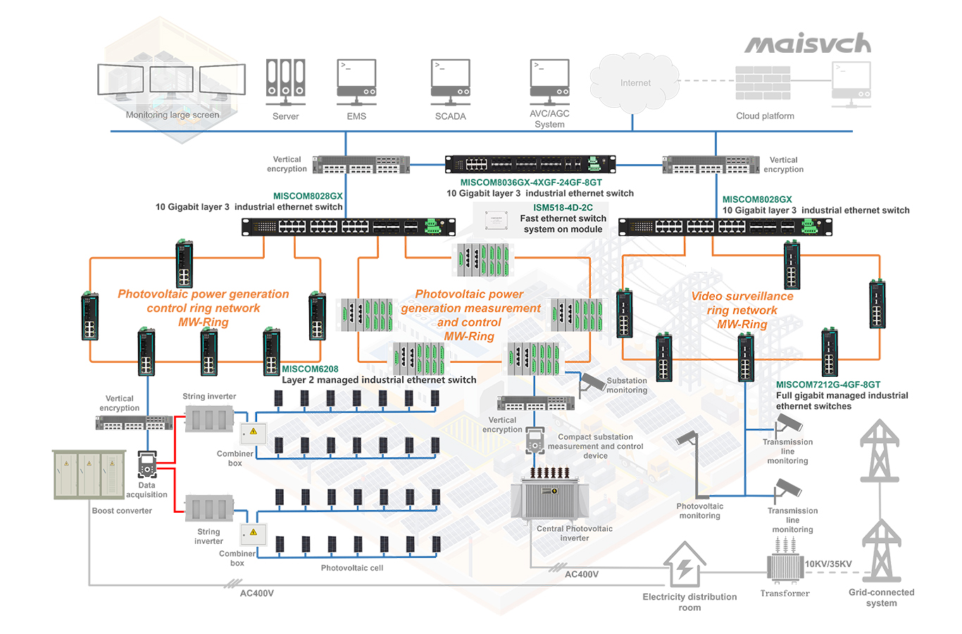 Maisvch provides comprehensive data acquisition and video monitoring solutions tailored specifically for solar PV power plants. Recognizing the dispersed and remotely located nature of photovoltaic arrays, Maisvch’s approach employs an efficient optical fiber ring topology, enhancing data integrity and reliability.